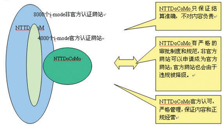 要解決上述問(wèn)題需要一個(gè)系統(tǒng)化的進(jìn)程,我們可以借鑒NTT DoCoMo的i-mode的管理模式,如圖5所示,這種管理模式的核心思路是將SP分成官方和非官方分別管理,并建立升降級(jí)制度,鼓勵(lì)SP升級(jí)。這樣做的好處是:1.明確運(yùn)營(yíng)商與SP的關(guān)系;2. 明確用戶投訴的對(duì)象;3. 降低SP進(jìn)入門檻,鼓勵(lì)SP開(kāi)發(fā)業(yè)務(wù)。