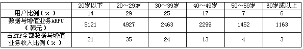 與競(jìng)爭(zhēng)對(duì)手SKT一樣,KTF針對(duì)不同年齡段的用戶建立了個(gè)性化的獨(dú)立服務(wù)品牌,這些服務(wù)品牌分別是BiGi(主要針對(duì)13~18歲的未成年人)、Na(主要針對(duì)18~25歲的青年學(xué)生)、Main(針對(duì)25~35歲的男性用戶)、Hyo(針對(duì)35歲以上用戶)以及DRAMA(針對(duì)所有年齡的女性用戶)。從各年齡用戶群的業(yè)務(wù)使用情況看,占總用戶43%的30歲以下年輕用戶是KTF最主要的數(shù)據(jù)與增值業(yè)務(wù)消費(fèi)群體。見(jiàn)表4。