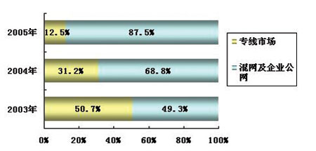 2004年,基于專線網(wǎng)絡(luò)的視頻會議系統(tǒng)與基于混網(wǎng)和企業(yè)公網(wǎng)的產(chǎn)品比例發(fā)生了轉(zhuǎn)折性變化,基于混網(wǎng)和企業(yè)公網(wǎng)的產(chǎn)品占到了68.8%的比例,成為了市場主流。計世資訊(CCW Research)研究表明:2005年,這一趨勢更趨明顯,基于混網(wǎng)和企業(yè)公網(wǎng)產(chǎn)品的比例將高達(dá)87.5%。