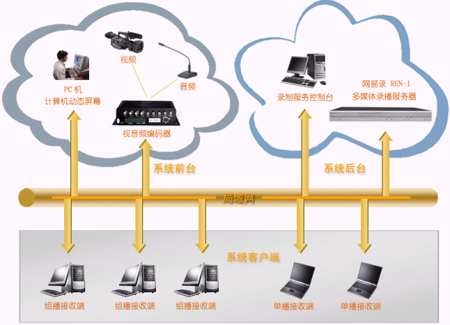 - 系統(tǒng)后臺:連接在網(wǎng)絡(luò)上即可,接受REN-1服務(wù)器管理端發(fā)送來的系統(tǒng)管理、維護(hù)指令,并負(fù)責(zé)將系統(tǒng)前臺發(fā)送來的視頻、音頻、計算機(jī)動態(tài)屏幕進(jìn)行實時錄制和直播,它包括:網(wǎng)易錄媒體中心(REN-1),它為系統(tǒng)的核心,主要完成視頻、音頻、計算機(jī)動態(tài)屏幕的錄制和直播;