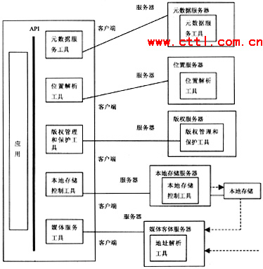 在DAVIC1.5AnytimeAnywhere文件中所規(guī)定的模型如圖2所示。在該圖中沒(méi)有描述任何與網(wǎng)絡(luò)相關(guān)的內(nèi)容。僅規(guī)定出在客戶端設(shè)備和服務(wù)器端設(shè)備中應(yīng)當(dāng)包含的功能模塊。即:元數(shù)據(jù)服務(wù)、位置解析、版權(quán)管理和保護(hù)、本地存儲(chǔ)控制、媒體服務(wù)。其基本思想為,在服務(wù)器端提供的所有功能。在客戶端設(shè)備中應(yīng)包含有相關(guān)的軟件工具。在業(yè)務(wù)的具體實(shí)施過(guò)程中,客戶端首先向服務(wù)器端請(qǐng)求幫助查找其感興趣的媒體內(nèi)容,由元數(shù)據(jù)服務(wù)器處理并返回相關(guān)信息。通過(guò)位置解析服務(wù)器來(lái)確定客戶端所選擇的媒體內(nèi)容所在的位置;經(jīng)過(guò)媒體管理和保護(hù)服務(wù)器的認(rèn)可:由本地存儲(chǔ)服務(wù)器向用戶提供媒體信息同時(shí)允許客戶端對(duì)媒體信息進(jìn)行控制。