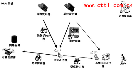 如圖4所示,DRM系統(tǒng)主要負(fù)責(zé)將內(nèi)容發(fā)布者發(fā)布的信息與版權(quán)發(fā)布者發(fā)布的信息組合起來(lái)將內(nèi)容變?yōu)槭鼙Wo(hù)的內(nèi)容,由版權(quán)客體提供使用規(guī)則,用戶在使用內(nèi)容時(shí)需要首先從DRM代理處根據(jù)使用規(guī)則獲得使用受保護(hù)內(nèi)容的密鑰,然后使用所獲得的密鑰對(duì)受保護(hù)的內(nèi)容進(jìn)行解碼并使用。