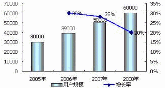 2006年1月?lián)Z盛發(fā)布的最新《2005-2006年移動(dòng)增值業(yè)務(wù)市場(chǎng)回顧與展望》報(bào)告數(shù)據(jù)顯示,2005年中國的移動(dòng)增值業(yè)務(wù)用戶規(guī)?倲(shù)達(dá)到了3億,市場(chǎng)規(guī)模達(dá)到近近4588億元。諾盛預(yù)計(jì),2006年移動(dòng)增值業(yè)務(wù)用戶規(guī)模將達(dá)到3.9億,市場(chǎng)規(guī)模為620億元;2007年在3G的刺激下,移動(dòng)增值業(yè)務(wù)用戶規(guī)模將達(dá)到5億,市場(chǎng)規(guī)模為810億元;2008年用戶規(guī)模將達(dá)到6億,市場(chǎng)規(guī)模為1053億。移動(dòng)增值業(yè)務(wù)用戶規(guī)模年增長率在20%以上,市場(chǎng)規(guī)模增長率在30%以上。