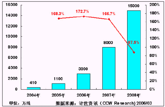 主流運營商N(yùn)GN網(wǎng)絡(luò)的規(guī);ㄔO(shè),為IP Centrex、寬帶電話等新業(yè)務(wù)在國內(nèi)的大規(guī)模應(yīng)用提供了良好的支撐。計世資訊(CCW Research)預(yù)計,在未來3年內(nèi),中國的NGN網(wǎng)絡(luò)建設(shè)規(guī)模將獲得快速增長,到2008年,將有望達(dá)到1.5億線的規(guī)模。