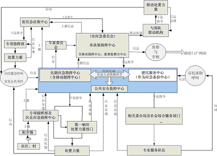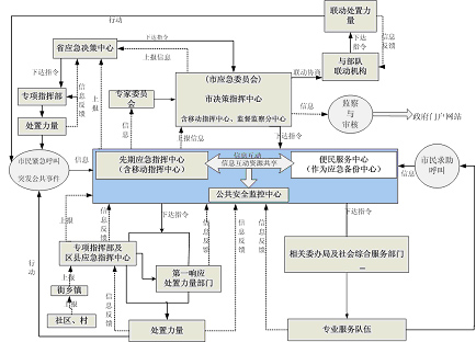 指政府決策指揮中心、先期指揮中心、便民服務(wù)中心、公共安全監(jiān)控中心,通常還有移動指揮中心和災備中心,以及其它節(jié)點的建設(shè)。一般地,先期指揮中心與便民服務(wù)中心可互為備份。政府決策指揮中心對重大、特別重大突發(fā)公共事件進行協(xié)調(diào)、決策,偏重于自然災害與生產(chǎn)安全方面,而一般、較重突發(fā)公共事件仍保持由各專業(yè)指揮部指揮、處置,只有當跨區(qū)、跨機構(gòu)需要協(xié)調(diào)時由政府決策指揮中心進行協(xié)調(diào)。