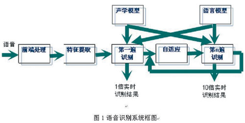 圖1所示為當(dāng)前大多數(shù)語音識別系統(tǒng)采用的框架和流程。原始語音經(jīng)前端處理后,從中提取出若干維的特征向量用于識別。識別時(shí),聲學(xué)模型和語言模型共同作用,得到使某一概率最大的字串作為識別結(jié)果。