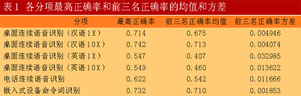從各分項(xiàng)前三名的正確率方差可以看出,漢語桌面連續(xù)語音識別和嵌入式設(shè)備命令詞分項(xiàng)中各系統(tǒng)的性能差異較小,而英語桌面連續(xù)語音識別,特別是一倍實(shí)時(shí)任務(wù)中各系統(tǒng)性能差異較大。這是因?yàn)楫?dāng)前語音識別的研究重點(diǎn)在于前者,研究者較多,研究也比較深入,而英語的識別相對來說研究者較少。