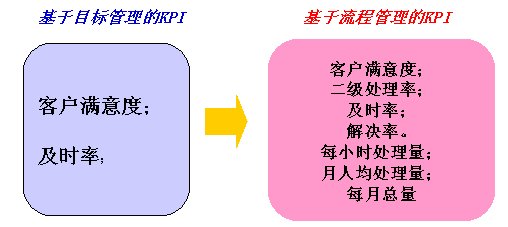 - 基于流程的指標(biāo)是一定可以在流程中可以測(cè)量到的,而基于目標(biāo)的KPI不一定。如:以前我們經(jīng)常提到的關(guān)于投訴處理的“一次處理率”指標(biāo),到目前為止,沒(méi)有人能解決其測(cè)量問(wèn)題。因此,我們重新定義了可測(cè)量的替代指標(biāo)(一級(jí)處理率、二級(jí)處理率和三級(jí)處理率:一級(jí)處理率指由前臺(tái)話務(wù)人員直接處理的投訴占整個(gè)投訴量的比率;二級(jí)處理率指由前臺(tái)客服中心后臺(tái)人員處理的投訴占整個(gè)投訴量的比率;三級(jí)處理率指由市公司投訴處理人員處理的投訴占整個(gè)投訴量的比率)。