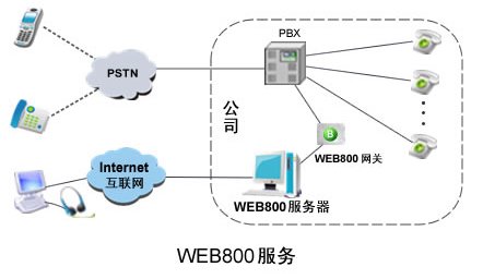 當網(wǎng)頁訪問客戶點擊該企業(yè)網(wǎng)站頁面上的WEB800圖標時,就可以直接撥打至已指定的企業(yè)內(nèi)部電話分機(或企業(yè)外部普通電話)。