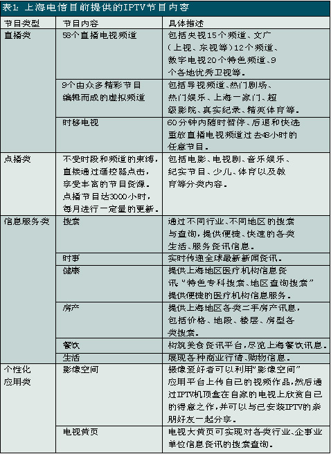 上海電信是國(guó)內(nèi)關(guān)注并切入IPTV業(yè)務(wù)較早的電信運(yùn)營(yíng)商之一,自2005年就開始積極測(cè)試和試驗(yàn)。此次上海電信在全上海市范圍內(nèi)推出IPTV業(yè)務(wù),被業(yè)界看作是“中國(guó)IPTV規(guī)模商用的新紀(jì)元”。除了影視節(jié)目收看、視頻內(nèi)容點(diǎn)播、時(shí)移功能外,上海電信的IPTV服務(wù)還包括時(shí)事新聞、遠(yuǎn)程醫(yī)療、視頻房產(chǎn)信息、餐飲信息、天氣預(yù)報(bào)、票務(wù)查詢等信息服務(wù)以及可視電話、IPTV游戲等個(gè)性化應(yīng)用。其中IPTV的直播頻道有58個(gè),視頻點(diǎn)播可選節(jié)目量達(dá)3000小時(shí)以上。另外,上海電信還推出了影像空間和電視大黃頁等應(yīng)用服務(wù),攝像愛好者可以利用“影像空間”應(yīng)用平臺(tái)上傳自己的視頻作品,然后通過IPTV機(jī)頂盒在自家的電視上欣賞自己的得意之作,并可以與已安裝IPTV的親朋好友一起分享;電視大黃頁可實(shí)現(xiàn)對(duì)各類行業(yè)、企事業(yè)單位信息資訊的搜索查詢。