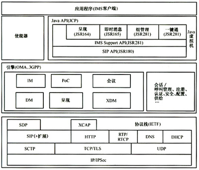 當(dāng)前的IMS技術(shù)工作主要集中在探討IMS網(wǎng)絡(luò)上,而忽視了對IMS客戶端的研究,然而,IMS客戶端才是最終用戶享受IMS技術(shù)帶來的諸多成果的最直接的表現(xiàn)方式。當(dāng)前還沒有統(tǒng)一的對IMS客戶端的定義,但根據(jù)作者的理解,可以將IMS客戶端定義為一個軟件包(包括了驅(qū)動程序、協(xié)議棧、各種引擎、應(yīng)用程序、人機(jī)界面等),并可運行在多種終端上(如移動終端、固定終端、PDA、臺式機(jī)、筆記本電腦等),可在IMS網(wǎng)絡(luò)架構(gòu)下提供多種實時與非實時IMS業(yè)務(wù)(如VoIP、視頻電話、呈現(xiàn)、即時消息、會議、組管理、一鍵通、協(xié)同工作、文檔共享等)和統(tǒng)一的用戶體驗,并且符合IETF、3GPP、OMA、JCP(Java community process,Java標(biāo)準(zhǔn)制定組織)等國際標(biāo)準(zhǔn)組織所規(guī)定的IMS相關(guān)規(guī)范。