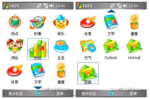 用戶登錄后會(huì)進(jìn)入聽網(wǎng)軟件的“頻道面板”,這是“移動(dòng)聽網(wǎng)”軟件的主界面,看上去相當(dāng)華麗,整合了豐富多彩的熱點(diǎn)信息,這里面的小圖標(biāo)分別代表熱點(diǎn)、時(shí)事、娛樂(lè)、兩性、財(cái)經(jīng)、生活、體育、文學(xué)、健康、天氣,除此之外,還集成了短信項(xiàng),根據(jù)用戶的設(shè)置還可以有Outlook和Hotmail,幾乎涵蓋了所有內(nèi)容,滿足了不同人群的需求。