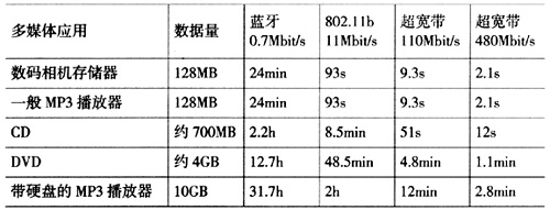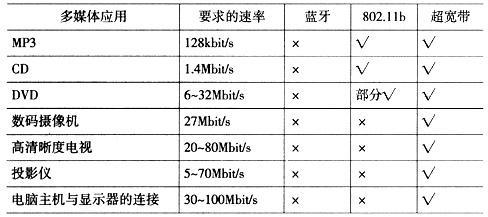 2.0接口相當(dāng),遠(yuǎn)遠(yuǎn)高于無線局域網(wǎng)802.11b的11 Mbit/s,也比下一代無線局域網(wǎng)802.11a/g的54 Mbit/s高出近一個數(shù)量級。UWB通信的功耗較低,能更好地滿足使用電池的移動設(shè)備的要求。另外,UWB信號的功率譜密度非常低,信號難以被檢測到,再加上采用的跳頻、直接序列擴頻等擴頻多址技術(shù),使非授權(quán)者很難截獲傳輸?shù)男畔,因而安全性非常好。?是一些典型的實時多媒體應(yīng)用對不同無線傳輸技術(shù)的數(shù)據(jù)傳輸速率的要求。從表中可以看出,如果采用無線的方式來進(jìn)行傳輸,只有UWB技術(shù)可以滿足各種應(yīng)用的要求。