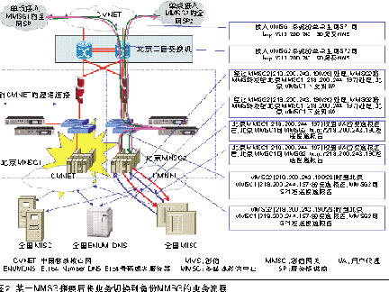 根據(jù)備份要求,相關網(wǎng)關進行了相應的數(shù)據(jù)配置,CMNET骨干網(wǎng)北京節(jié)點交換機將北京MMSG2的端口關閉(Shutdown),同時刪除到北京MMSG2的路由,同時,放寬到北京MMSG1的路由,從218.200.243.128/27調(diào)整為218.200.243.128/26。