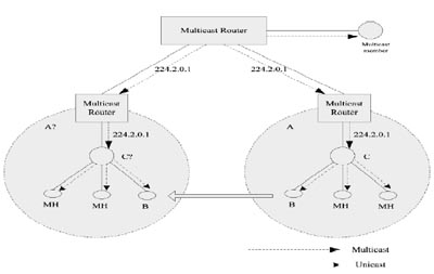在極端的情況下,網(wǎng)絡(luò)A中組播組224.2.0.1只有C一個(gè)組播成員且網(wǎng)絡(luò)A中后來(lái)也無(wú)其他MH加入組播組224.2.0.1,C將通知上游路由器退出組播組224.2.0.1,這時(shí)候需要重新構(gòu)建組播樹(shù);而在網(wǎng)絡(luò)A′中,原來(lái)也沒(méi)有組播組224.2.0.1的組成員,當(dāng)B要求加入組播組224.2.0.1時(shí),網(wǎng)絡(luò)A′中的組播代理C′需要向上游網(wǎng)絡(luò)路由器發(fā)送加入組播組224.2.0.1的請(qǐng)求,然后向B轉(zhuǎn)發(fā)該組的組播數(shù)據(jù)包,這時(shí)的切換有可能因?yàn)榍袚Q時(shí)延而導(dǎo)致組播數(shù)據(jù)包丟失。