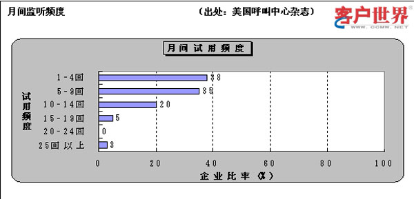 很多管理人感到頭疼的是,如何以監(jiān)聽的方式計(jì)算品質(zhì)分?jǐn)?shù)。圖中顯示關(guān)于監(jiān)測(cè)頻度的調(diào)查結(jié)果。雖然判斷適當(dāng)?shù)谋O(jiān)聽頻度也很重要,但最重要的是評(píng)價(jià)單上該填入哪些項(xiàng)目,這才是管理人最關(guān)心的事情。根據(jù)自己公司的狀況,選擇關(guān)于會(huì)話技能、業(yè)務(wù)知識(shí)、案件處理能力、技術(shù)水平、完成業(yè)務(wù)請(qǐng)求的程度等項(xiàng)目就可以。很多公司對(duì)外不公開這些評(píng)價(jià)單,說這屬于經(jīng)營(yíng)客服中心的經(jīng)驗(yàn)技術(shù),但從“友好競(jìng)爭(zhēng)”的角度看,在業(yè)內(nèi)公開這種程度的“經(jīng)驗(yàn)技術(shù)”,不會(huì)構(gòu)成中心實(shí)力上的競(jìng)爭(zhēng)。