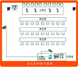 中大型會議室約在150~250平米,一般為教室型布局,即主要人員和領(lǐng)導(dǎo)在主席臺就座,參會人員在臺下就坐,這種情況的布局和設(shè)備放置的情況如圖所示。