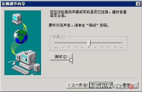 單擊“下一步”跳過Netmeeting服務器設置,此時向?qū)髮τ嬎銠C聲卡和麥克風進行測試,如圖5。