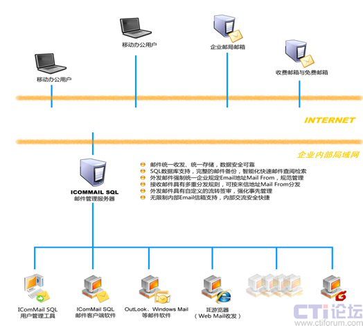 IComMail SQL企業(yè)郵件管理系統(tǒng)是?弟浖瞥龅膬(yōu)秀的郵件管理軟件,自2003年首推自今已有5年的發(fā)展歷史,系統(tǒng)設計先進、功能獨特完整、運行穩(wěn)定可靠,在國內已有大批裝機用戶,其中以外貿、進出口等外向型企業(yè)為主要用戶群,廣大用戶已經獲得了極大的受益。IComMail SQL系統(tǒng)主推的是其強大的郵件管理功能,與通常的郵件服務器Mail Server系統(tǒng)有著根本的區(qū)別,也有別于日趨流行的企業(yè)郵局服務,IComMail SQL系統(tǒng)是建立在通常的郵件服務器Mail Server或企業(yè)郵局的應用基礎上的,在企業(yè)局域網內設立一IComMail郵件管理服務器,并采用穩(wěn)定可靠的SQL數(shù)據庫系統(tǒng)作為支撐,為企業(yè)建立安全可靠的企業(yè)郵件數(shù)據中心,并在此基礎上,擴展了很多高級的企業(yè)郵件管理功能,使企業(yè)的郵件應用水平有質的提升。