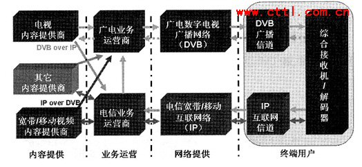從圖2中我們可以看出,IPTV實(shí)際上有電信和廣電兩條業(yè)務(wù)通道。其中,電信的業(yè)務(wù)通道是雙向的通道,而廣電的業(yè)務(wù)通道是單向的,電視內(nèi)容提供商可以利用DVBoverIP技術(shù)通過電信業(yè)務(wù)運(yùn)營商來開展IPTV業(yè)務(wù)。寬帶/移動(dòng)視頻內(nèi)容提供商也可以利用IPover