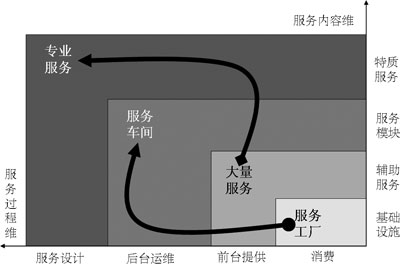表1中以“★”標(biāo)識的服務(wù)基本上都是電信運營企業(yè)開展移動信息化后向客戶提供的服務(wù),可以明顯看出,更高的顧客參與度、更多的顧客化是這些服務(wù)的共同特點,所以,移動信息化運營的就是由服務(wù)工廠向服務(wù)車間轉(zhuǎn)型、由大量服務(wù)向?qū)I(yè)服務(wù)轉(zhuǎn)型。