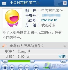 你可以點擊藍(lán)色文字鏈接,在彈出的窗口中單擊左下角的“播放/暫!卑粹o,以實現(xiàn)在PC機(jī)上聽好友彩鈴(如圖5)!這樣的功能其它IM軟件好像沒有,唯飛信才有的獨家功能!
