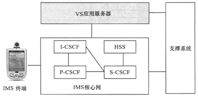 IMS的VS業(yè)務(wù)架構(gòu)如圖2所示,由IMS終端(支持SIP協(xié)議手機(jī))、IMS核心網(wǎng)、VS應(yīng)用服務(wù)器、支撐系統(tǒng)4部分構(gòu)成。IMS移動(dòng)終端提供了用戶使用VS業(yè)務(wù)的操作界面,包括VS業(yè)務(wù)發(fā)起、視頻播放、視頻存儲(chǔ)、VS業(yè)務(wù)應(yīng)答等功能。IMS核心網(wǎng)在支持視頻共享業(yè)務(wù)中,涉及到P-CSCF、S-CSCF、I-CSCF等網(wǎng)元,這些網(wǎng)元的作用是完成SIP移動(dòng)終端之間會(huì)話控制功能,包括會(huì)話的建立、會(huì)話的保存、會(huì)話的釋放等過程。VS應(yīng)用服務(wù)器是VS業(yè)務(wù)系統(tǒng)中最關(guān)鍵的功能實(shí)體,其功能包括對(duì)VS業(yè)務(wù)的請(qǐng)求進(jìn)行信令和媒體流的控制。由于基于IP的H.263協(xié)議能保證在較低的帶寬下傳送較高質(zhì)量的視頻流,因此首選H.263作為VS業(yè)務(wù)的視頻壓縮協(xié)議。此外,為了實(shí)現(xiàn)不同編碼能力的終端能進(jìn)行業(yè)務(wù)互通,VS應(yīng)用服務(wù)器還具備媒體編碼轉(zhuǎn)換的功能。VS應(yīng)用服務(wù)器另一重要的功能就是實(shí)現(xiàn)VS業(yè)務(wù)計(jì)費(fèi),它支持基于業(yè)務(wù)計(jì)費(fèi)、事件計(jì)費(fèi)、時(shí)間計(jì)費(fèi),流量計(jì)費(fèi)等多種靈活的計(jì)費(fèi)方式,并生成計(jì)費(fèi)話單。支撐系統(tǒng)的功能主要是實(shí)現(xiàn)VS業(yè)務(wù)定購(gòu)、業(yè)務(wù)取消、計(jì)費(fèi)話單的收集匯總等。