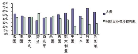 除了每周使用量之外,Ovum還向被調(diào)查者詢問是什么因素阻礙了他們通過(guò)手機(jī)應(yīng)用上述程序,被提及的最大顧慮是價(jià)格昂貴,其次是沒有興趣。在歐洲一些國(guó)家,對(duì)業(yè)務(wù)不感興趣是和費(fèi)用昂貴同等重要的原因,在荷蘭,選擇對(duì)移動(dòng)業(yè)務(wù)不感興趣的比例甚至超過(guò)了認(rèn)為費(fèi)用昂貴的比例。此外很有趣的是,沒有一個(gè)被調(diào)查者表示因?yàn)槭謾C(jī)沒有這些功能而導(dǎo)致無(wú)法使用業(yè)務(wù)。(見圖4)