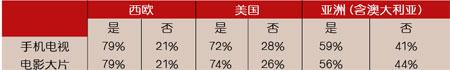 Ovum還詢問了被調(diào)查者對(duì)于手機(jī)電視和電影大片的看法,對(duì)于這兩項(xiàng)業(yè)務(wù),正面積極的回應(yīng)率很低,很少有人愿意支付額外費(fèi)用來(lái)購(gòu)買手機(jī)電視或是精彩大片,但是也有被調(diào)查者表示愿意接受廣告以換取免費(fèi)的電視和電影內(nèi)容。
