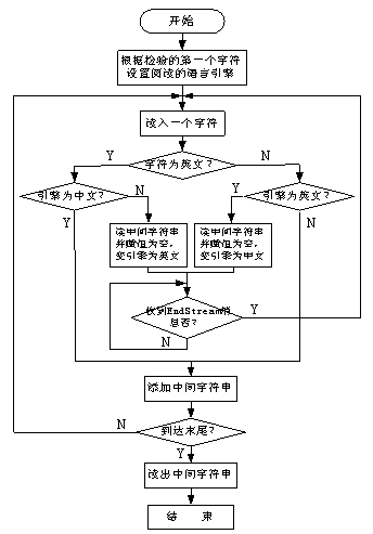 Sam,這樣就實現(xiàn)了中英文混合文本的朗讀。具體的解決方案是:依序處理文本中每個字符,判斷字符中含有的中英文類型,若類型與前一字符相同則添加至中間變量,否則朗讀中間變量文本并保存當前位置,接著切換引擎。文本朗讀結(jié)束,發(fā)出EndStream消息,從當前位置繼續(xù)循環(huán)。其流程圖如圖4所示。