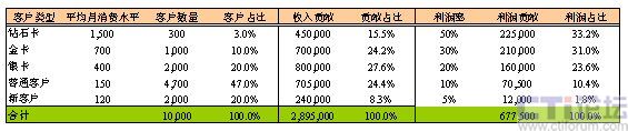同時,如下表2所示,我們給定了不同客戶分群的客戶平均月消費水平及利潤貢獻比率。通過計算可以得出,高端的鉆石卡客戶雖然僅占客戶數(shù)的3%,貢獻了收入的15.5%,卻貢獻了三分之一的利潤。而占近半數(shù)的普通客戶,大約貢獻了收入的四分之一,僅僅貢獻了利潤了10%左右。在一些行業(yè)中,服務(wù)和交易成本所占比重較高,普通客戶群甚至有可能會帶來負利潤。