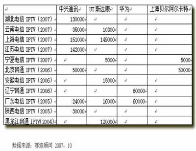 中興通訊“EyeWill網(wǎng)絡視訊”國內(nèi)IPTV市場斬獲頗豐:中標云南電信昆明和麗江兩地市的IPTV試點項目;獨家中標陜西電信IPTV項目,用戶規(guī)模3萬線;獨家中標江蘇電信IPTV項目,以及廣東電信佛山、東莞等地IPTV項目;與上海貝爾阿爾卡特平分了北京網(wǎng)通5萬線用戶規(guī)模的IPTV訂單;2006年6月,成為上海電信IPTV商用項目的設備提供商之一。在成為國內(nèi)IPTV解決方案供應商贏家的同時,中興通訊“EyeWill網(wǎng)絡視訊”還成功進入了歐洲、拉美、東南亞等多個海外市場。