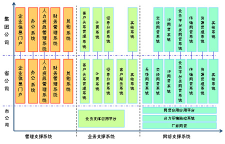 從系統(tǒng)的部署來(lái)看,主要集中在集團(tuán)與省公司,其中,集團(tuán)公司系統(tǒng)主要具備面向全公司的企業(yè)管理、經(jīng)營(yíng)分析等功能;省公司從以職能管理為主逐步轉(zhuǎn)變?yōu)橐陨a(chǎn)管理為主,具有了越來(lái)越多的生產(chǎn)職能,在運(yùn)營(yíng)支撐系統(tǒng)建設(shè)中的作用更加突出;市公司的生產(chǎn)管理職能有所削弱,將主要負(fù)責(zé)市場(chǎng)的具體營(yíng)銷(xiāo)、客戶(hù)支撐以及設(shè)備的現(xiàn)場(chǎng)維護(hù)等工作,F(xiàn)有系統(tǒng)主要存在以下幾個(gè)問(wèn)題: