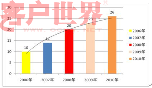 圖一:2006年~2010年中國服務(wù)產(chǎn)業(yè)基地建設(shè)數(shù)量現(xiàn)狀和趨勢預(yù)測