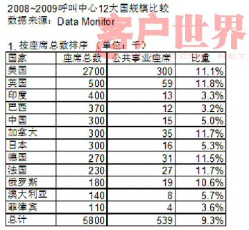 根據Data Monitor公司近年的分析報告,12呼叫中心大國在2008~2009年度共有呼叫中心座席580萬個,其中公共事業(yè)類呼叫中心座席54萬個,占9.3%。