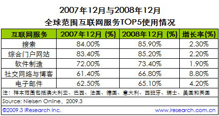 iResearch艾瑞咨詢根據(jù)NielsenOnline公布的全球范圍內(nèi)排名前五位的互聯(lián)網(wǎng)服務(wù)使用情況發(fā)現(xiàn),2008年在全球范圍內(nèi),社交網(wǎng)絡(luò)與博客的發(fā)展最為迅速。數(shù)據(jù)顯示,在包括搜索、綜合門戶網(wǎng)站、軟件制造、社交網(wǎng)絡(luò)與博客以及電子郵件在內(nèi)的五項互聯(lián)網(wǎng)服務(wù)中,相對2007年12月,2008年12月社交網(wǎng)絡(luò)與博客的使用情況增長率最高,達(dá)8.8%。而搜索、綜合門戶網(wǎng)站、軟件制造的增長率,分別為2.3%、2.2%、1.9%,均不足社交網(wǎng)絡(luò)與博客增長率的二分之一。高增長帶動社交網(wǎng)絡(luò)與博客服務(wù)在2008年12月以66.8%的使用率反超電子郵件(65.1%),躍居TOP5網(wǎng)絡(luò)服務(wù)第四位。