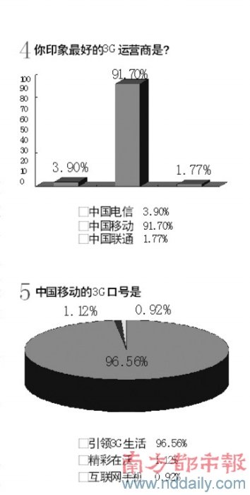 1、中國移動的3G口號是?超過98%的被訪者選擇了“引領(lǐng)3G生活”這一正確選項。2、你是否考慮升級到3G手機?選擇“會升級”的接近80%。如果考慮升級到3G手機,你最想使用哪家運營商的服務?中國移動奪得了超過九成的選票。但當最后問到,“你印象中,中國移動的3G標準是?”時,正確選項T D -SCD M A的得票率竟只有三成左右。