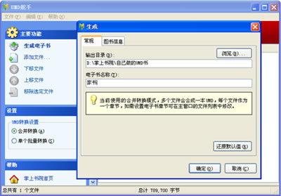 點擊“添加文件”,將你想要轉(zhuǎn)換的電子書添加至軟件窗口,大批量轉(zhuǎn)換的用戶可一次性選中多個文件添加,添加完畢后,你可以隨時通過“上移文件”和“下移文件”按鈕來調(diào)整你文件擺放的位置,或者移除不需要轉(zhuǎn)換的文件。確認(rèn)后,選擇合并轉(zhuǎn)換或是單個批量轉(zhuǎn)換,合并轉(zhuǎn)換是將添加的文件合并成一本UMD電子書,單個批量轉(zhuǎn)換是每個文件生成一本UMD電子書。設(shè)置完后點擊“生成電子書”,在彈出的對話框中設(shè)置輸出目錄、電子書名稱、電子書封面、作者、來源后點擊確認(rèn),出現(xiàn)正在轉(zhuǎn)換的進(jìn)度條,完成制作后會自動打開電子書所在的目錄,你的電子書制作完成,是不是非常簡單。