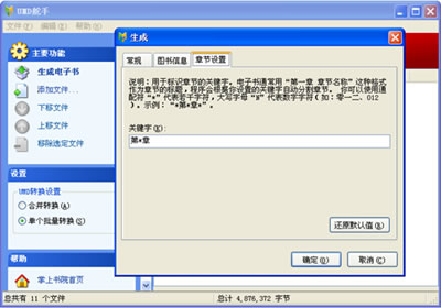 對于單個批量轉(zhuǎn)換的用戶而言,UMD舵手擁有智能斷章功能,完美解決了TXT電子書在手機(jī)上無法分章的難題。在“章節(jié)設(shè)置”選項卡中輸入用于制作章節(jié)目錄的關(guān)鍵字。例如:1、“第一章華山論劍”,則輸入的關(guān)鍵字可為:“第*章”;“一、華山論劍”,則輸入的關(guān)鍵字可為:“N、”;“【華山論劍】”,則輸入的關(guān)鍵字可為:“【*】”;“1-3-5節(jié):華山論劍”,則輸入關(guān)鍵字可為:“N-N-N