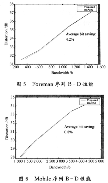 將圖4~圖6對比可以看出,對于運動程度很低且紋理相對平緩的Akiyo序列來說,相對盡力而為ARQ機制,本文的機制在3%的丟包情形下可以節(jié)省20%以上的帶寬。而對運動較為劇烈的Foreman序列來說,則只能節(jié)省4%的帶寬。對紋理很復雜的Mobile序列,本文的算法相對于BEARQ,帶寬僅節(jié)省不到1%。從表1的重發(fā)率和圖4~圖6的對應(yīng)關(guān)系不難看出,重發(fā)率越高,則對應(yīng)B-D性能的改善程度就越低。因此可以說實驗仿真表明了本文提出的傳輸控制算法,能夠在保證視頻接收質(zhì)量的同時,有效降低傳輸所用帶寬。