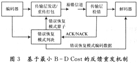 式中:rg是指出錯的部分被正確重傳到接收端的比特數(shù)。當r0≥(1-p)r+pr/(1-p)時,所有出錯的比特都實現(xiàn)了重傳,所以終端接收失真等于編碼端失真。否則,則按照式(7)中的兩個關(guān)系式,即可得到d0關(guān)于r0的表達式(5)。確立了上述關(guān)系后,結(jié)合相關(guān)的容錯平臺,設(shè)計出基于B-DCost的反饋重發(fā)機制,其原理框圖如圖3所示。