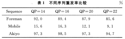 為了更全面評價本算法的性能,對不同測試序列在同樣丟包率情況下對本章的機制進行性能測試?紤]到影響本章算法性能的包括序列的紋理復雜程度以及運動劇烈程度。這里利用運動較為劇烈但紋理相對較單一的Foreman序列,紋理復雜程度較高的Mobile以及運動程度較低的Akiyo序列作為評測序列。表1是對這三個測試序列在QP=14,16,20,22,丟包率為3%的情況下前100幀做的統(tǒng)計,其中出錯Slice個數(shù)為24,則出錯宏塊總數(shù)為24×11=264。令NMB=264,則根據(jù)模式判決結(jié)果,即可得到對重發(fā)率的統(tǒng)計。