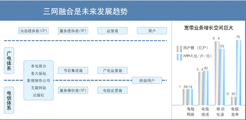 蘇少林:三網(wǎng)融合的推進(jìn)對于我國在“后危機(jī)時代”拉動國內(nèi)消費、形成新的經(jīng)濟(jì)增長點有著積極的意義。據(jù)測算,三網(wǎng)融合可帶動6000億元~7000億元的投資和消費,還可增加20萬個就業(yè)崗位,由此推動的固網(wǎng)寬帶業(yè)務(wù)將拉動GDP增長0.8個百分點。因此,電信監(jiān)管部門要站在大力推動信息產(chǎn)業(yè)和文化產(chǎn)業(yè)發(fā)展、提高國民經(jīng)濟(jì)和社會信息化水平、滿足人民群眾日益多樣的生產(chǎn)和生活服務(wù)需求的高度上來推進(jìn)三網(wǎng)融合。