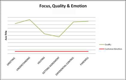 第二張圖片中客戶(hù)在很生氣的狀態(tài)下開(kāi)始呼叫,而代理除了幫助階段外表現(xiàn)得都很好。該代理執(zhí)行的是最低績(jī)效標(biāo)準(zhǔn),但他對(duì)客戶(hù)的影響卻等于零。分析師提出了一個(gè)非常明顯而重要的關(guān)節(jié)——幫助是整個(gè)呼叫中最為重要的環(huán)節(jié)。這就是我們要做的事情。如果在幫助這一環(huán)上沒(méi)做好,那么其它環(huán)節(jié)如感謝客戶(hù)、問(wèn)候客戶(hù)等等都變得無(wú)足輕重。