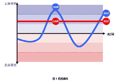 諾貝爾獎得主心理學(xué)家Daniel Kahneman發(fā)現(xiàn)人們在一次體驗(yàn)中只會記住兩件事:峰值感受(流程中最好或最差的一點(diǎn))以及終了感受。我運(yùn)用“峰值——終了規(guī)則”將每個(gè)子流程上的情感感受按照自然時(shí)間順序連成一根“情感”曲線,如圖1所示。