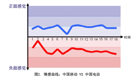 圖2的情感曲線分別是中國移動的“喜愛”情感曲線和中國電信的“討厭”情感曲線,對應(yīng)于雙方整個(gè)呼入電話體驗(yàn)18個(gè)子流程上的情感感受。(注意,我們只列出了中國移動的“喜愛”曲線和中國電信的“討厭”曲線來舉例說明。)