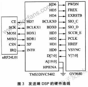 該芯片使用OmniVision公司自主開(kāi)發(fā)的SCCB總線進(jìn)行控制,使用三線連接。其中SCCB_E為串口允許/禁止信號(hào)線,SIO_C和SIO_D分別為串口時(shí)鐘線和數(shù)據(jù)線。系統(tǒng)中僅對(duì)OV9640進(jìn)行控制而不需要獲知其狀態(tài),采用DSP的McBSPO端口進(jìn)行連接,其中HD3用于打開(kāi)串口,BCLKX0和HDX0分別用于發(fā)送時(shí)鐘信號(hào)和控制數(shù)據(jù)。具體的硬件連線如圖3所示。