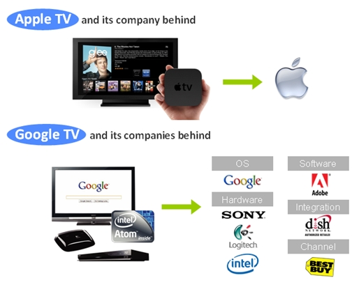 就硬體開發(fā)上來看,Apple TV是由Apple獨(dú)立開發(fā)的一臺(tái)機(jī)頂盒式外接裝置,用來裝連于用戶原本的電視上;而Google TV則是由Google主導(dǎo)、并與其他六家廠商共同合作分工,實(shí)體產(chǎn)品則可以是Sony開發(fā)的Google TV電視機(jī)/藍(lán)光播放機(jī)或Logitech制造的機(jī)頂盒,而未來Google也承諾會(huì)讓更多廠商共同投入這塊市場。讓簡單來說,Google TV的實(shí)體可以是一臺(tái)獨(dú)立的電視機(jī)產(chǎn)品,也可以像Apple TV一樣是外接式的裝置。