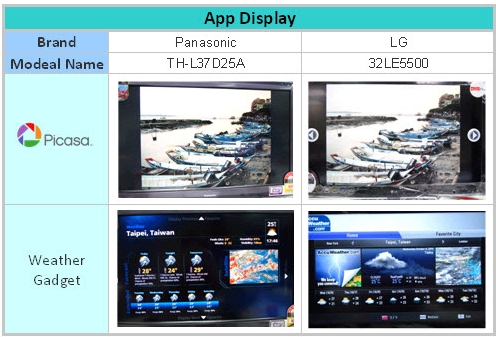為了了解這三臺(tái)Smart TV實(shí)際操作應(yīng)用程序時(shí)的順暢度,我們特別比較了幾個(gè)它們支持的應(yīng)用程序。包括Youtube的影片播放、Picasa影像的開啟與呈現(xiàn)、影像的幻燈片瀏覽和氣象頻道等功能,多以LG這臺(tái)Smart TV的處理與反應(yīng)速度較佳,不僅開啟Youtube時(shí)間短,瀏覽影像與開啟氣象頻道時(shí)也最為快速。唯獨(dú)在Picasa的影像呈現(xiàn)上,可以看出Panasonic的影像明顯較LG來的清晰細(xì)致。另外,在天氣頻道的功能部份,Panasonic與LG皆能支持四組城市的設(shè)定,提供基本天氣預(yù)報(bào)與衛(wèi)星云圖的資訊,并讓使用者持續(xù)追蹤天氣變化,但Panasonic有更多的氣候,兩層的設(shè)計(jì)讓使用者能深入獲得更多相關(guān)資訊,因此需要較長處理時(shí)間也不失合理。