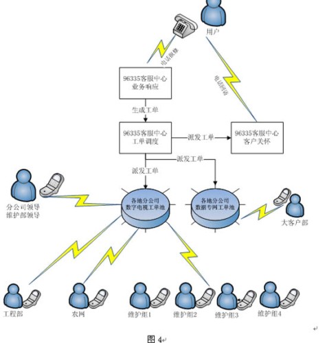 用戶致電96335呼叫中心的工單,由96335的中心處理席根據(jù)工單反應(yīng)的細節(jié)分派到各個服務(wù)站,移動實時工作流根據(jù)預(yù)先設(shè)定的工作流程和條件流轉(zhuǎn)到相關(guān)的處理人,服務(wù)人員在移動智能手機終端的客戶端軟件可以查詢他所要辦理的工單,已經(jīng)完成辦理的工單,根據(jù)工單的詳細內(nèi)容上門為用戶解決問題,并通過客戶端軟件填寫問題處理的結(jié)果。由移動實時工作流將處理結(jié)果按預(yù)設(shè)的流程反饋到呼叫中心節(jié)點,呼叫中心的回復(fù)席根據(jù)處理結(jié)果對用戶進行服務(wù)的回訪并將工單歸檔,完成一個閉環(huán)的服務(wù)流程。